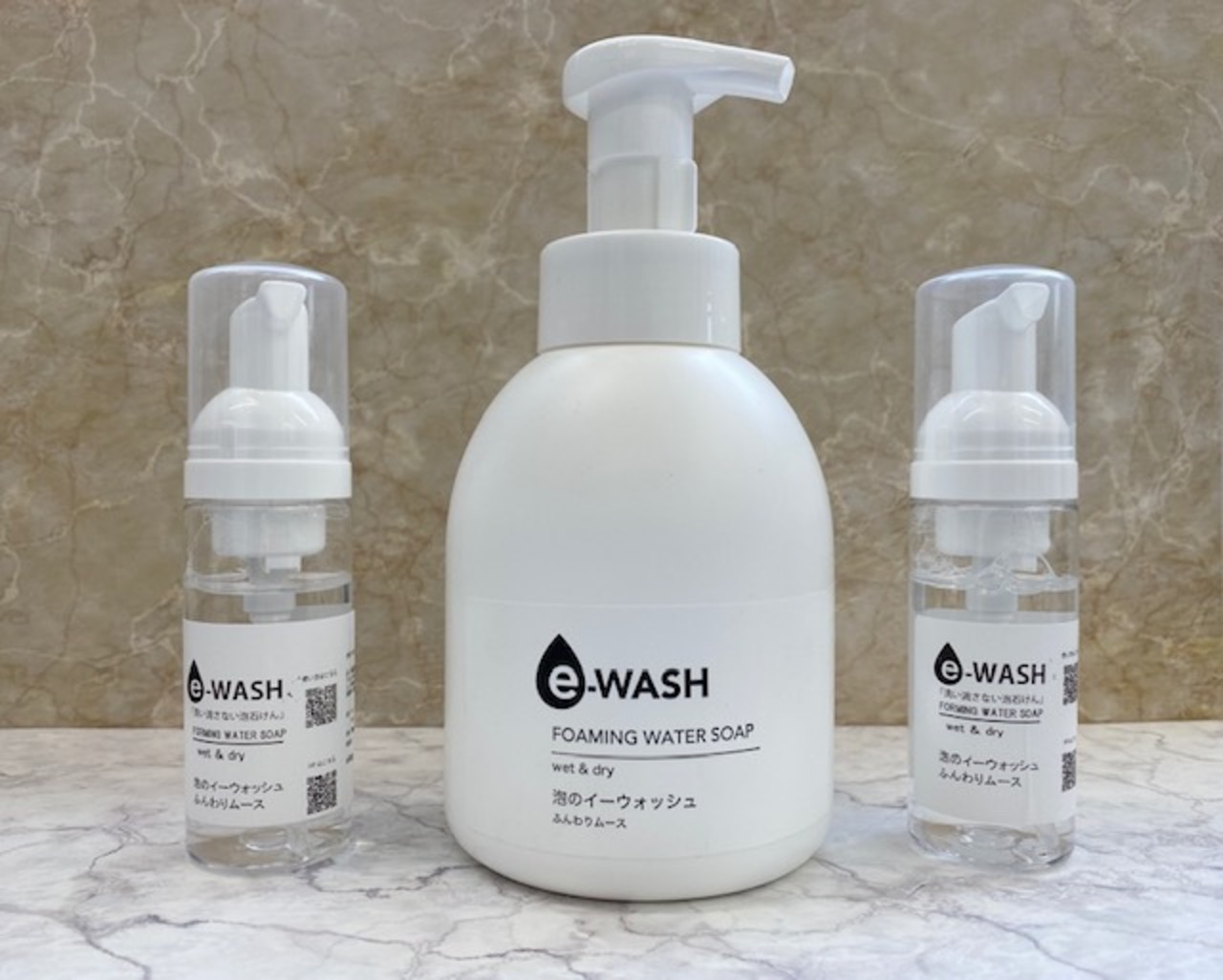 ●純水を独自方法の電気分解により生成されたアルカリ電解水(SAIW / スーパーアルカリイオン水 ※パッチテスト済み)と、無香料の純せっけんから作られた「泡のe-WASH」。